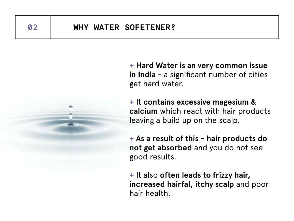 • Our scalp needs a pH of 4.5 and hard water has a pH greater than 8.5 - making it harsh for your scalp. Adding this water softener would balance the pH of your bathing water. This helps in maintaining scalp health.