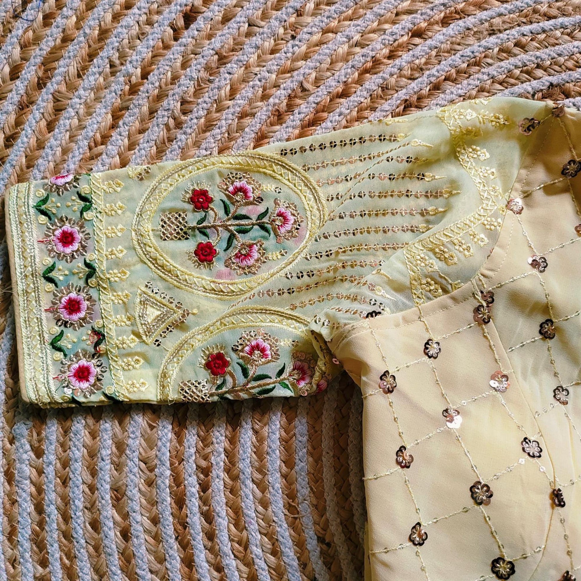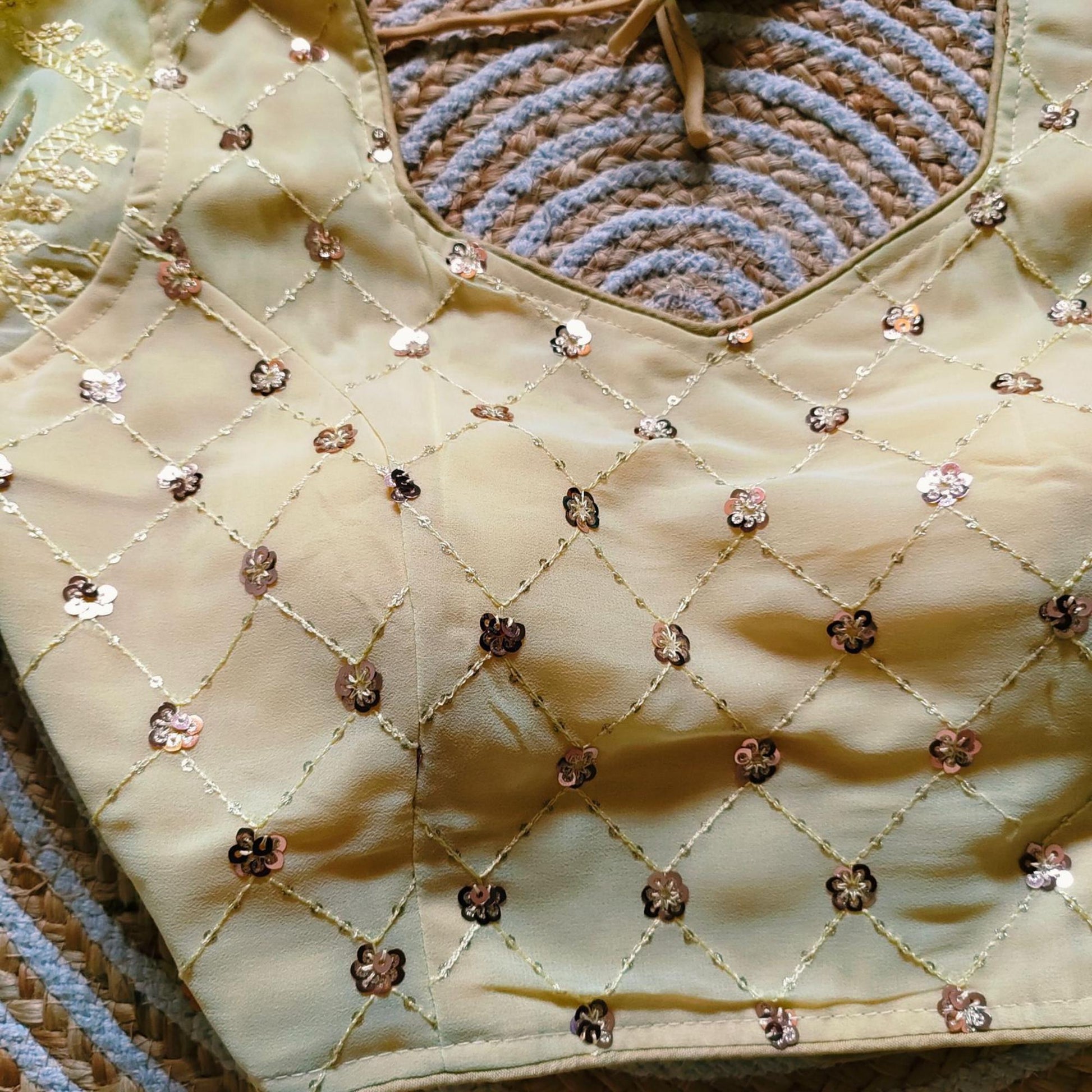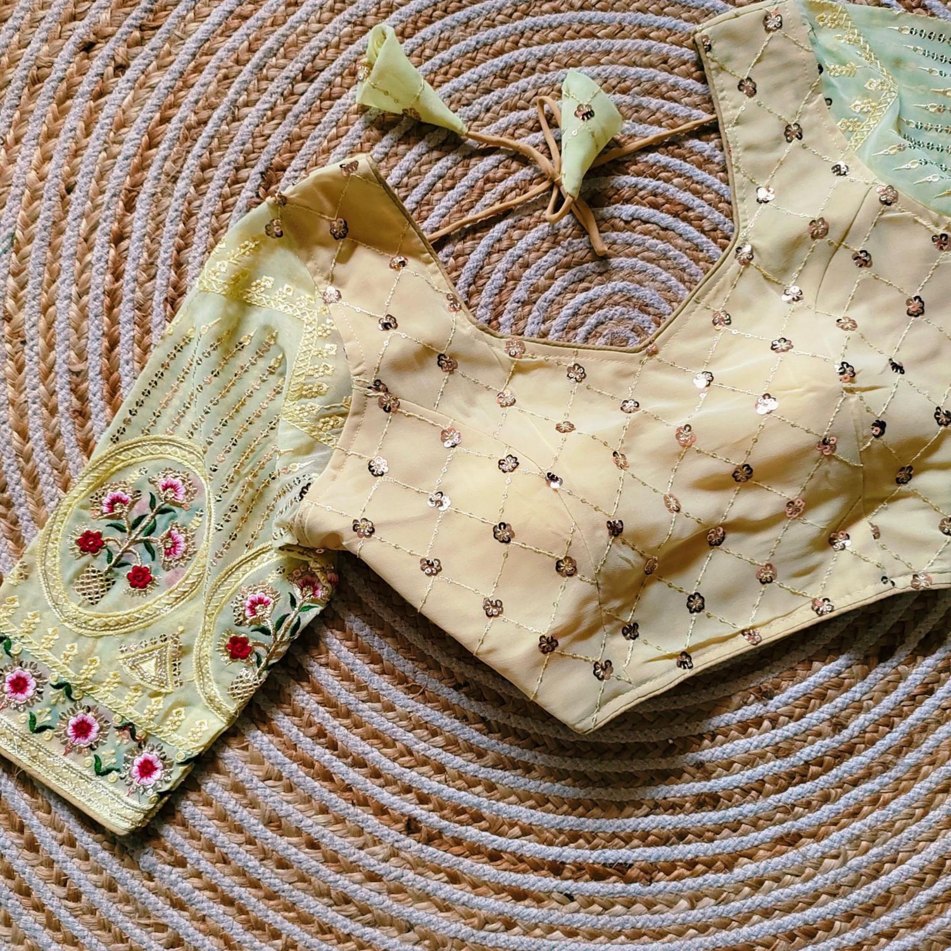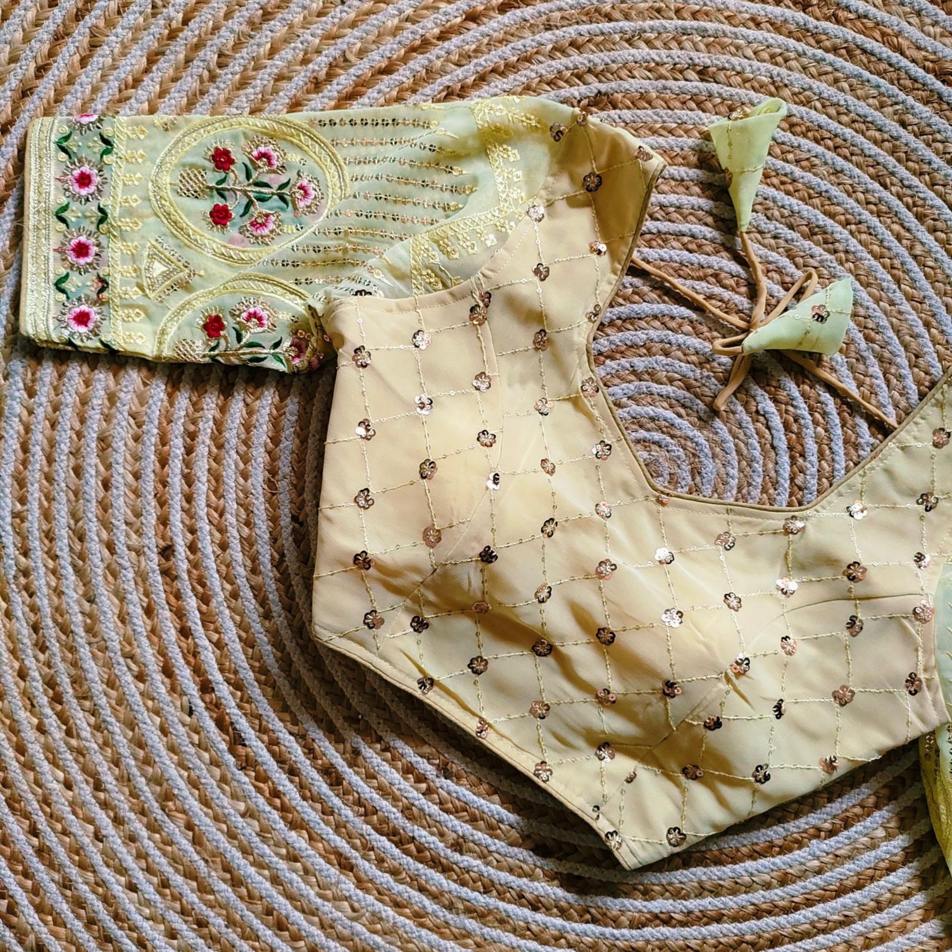 Designer blouses are often crafted from premium-quality materials such as silk, chiffon, satin, or organza, chosen for their luxurious texture, durability, and draping properties.