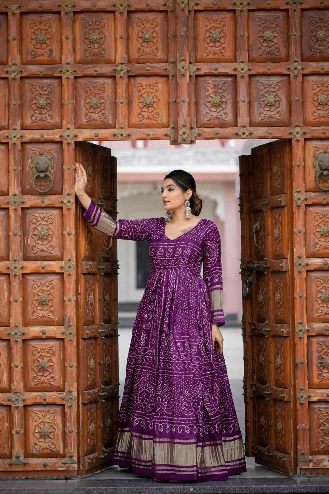 Gaji Silk With Bandhej Print Long Anarkali Gown Dresses
