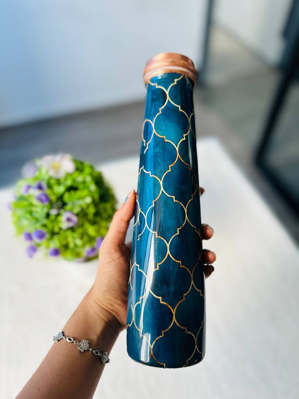 Add a touch of tradition and wellness to your daily hydration with this beautifully crafted Meenakari Print Tower Copper Water Bottle. Designed with an elegant floral pattern, this 1-liter leak-proof bottle is made from high-quality copper and features an airtight lid for everyday convenience. Inspired by Ayurvedic practices, copper bottles have been traditionally used for their unique material properties and cultural significance.