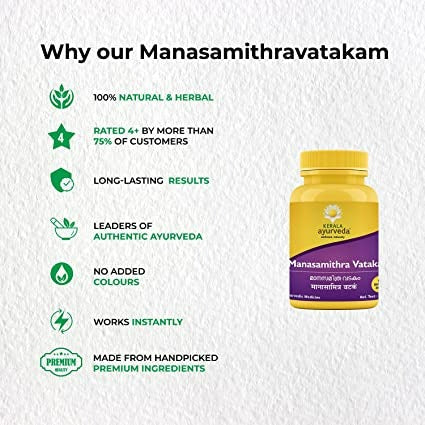 • Manasamithravatakam Pills helps calm down the mind and helps in getting sound sleep. A neuroprotective formulation, it helps relieve symptoms of depression.
