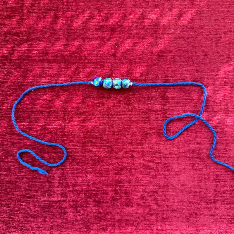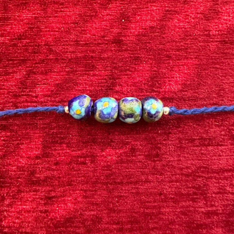Here's a special hand paintedBlue Pottery rakhi for your loved one. Humbly packaged in an envelope with a message, roli and rice. This is a symbol of prosperity of the India traditional crafts and is made by Vimal and his team of artisans.