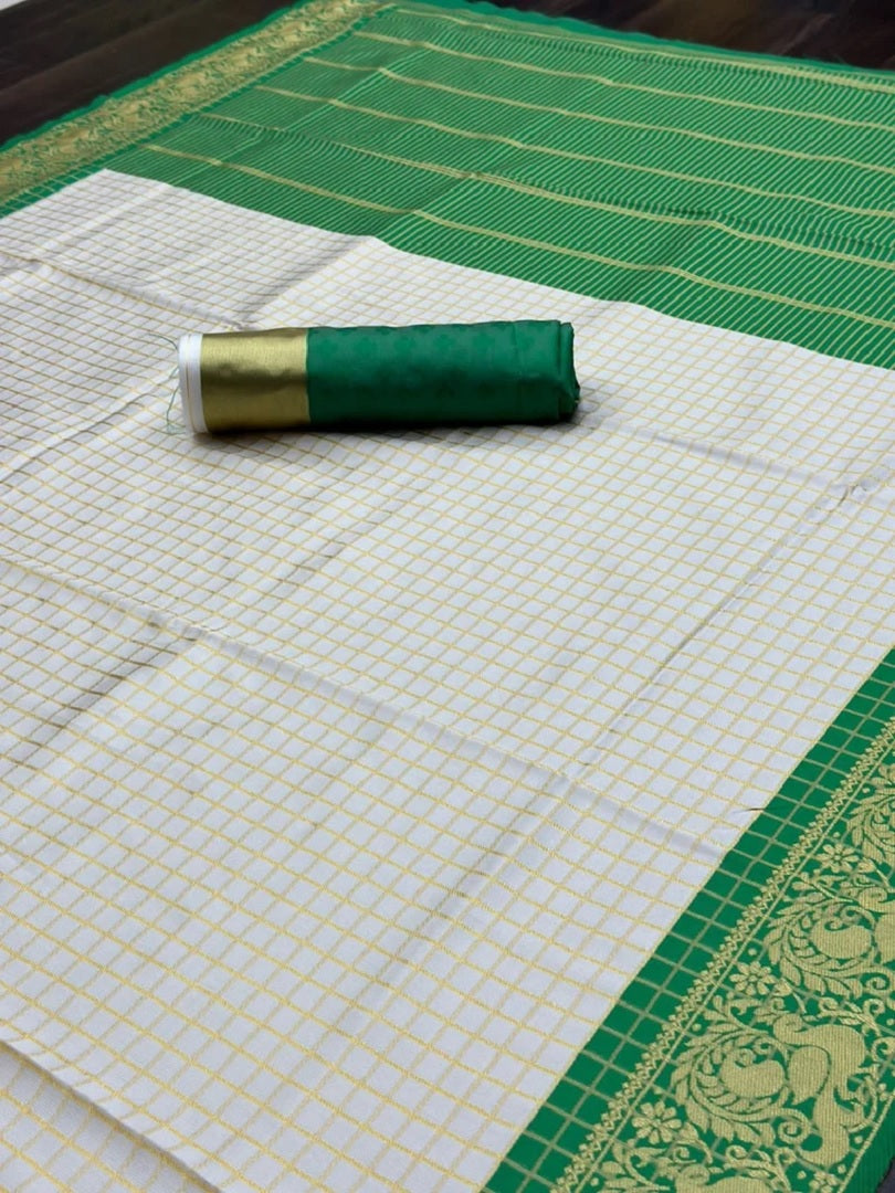 Green & White Ethnic Chexs Lichi Silk Blend Banarasi Saree