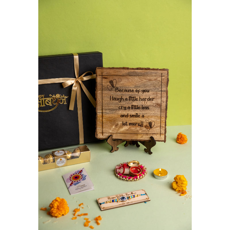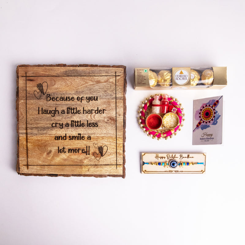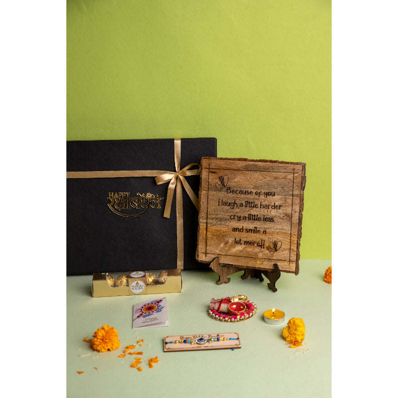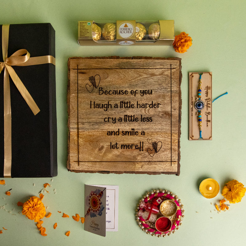 A perfect gift set for your brother on the occasion of Rakhi, send this thoughtfully created hamper box to your sibling which will make them cherish the bond of sibling togetherness. The Rakhi Gift Hamper consist of 1 Rakhi on a wooden base engraved with "Happy Raksha Bandhan", a mini card with a heartfelt quote, A Ferrero Rocher chocolate gift pack, a small thali with 1 bottle of Vermillion and 1 bottle of Rice along with two mini bowls in a gift box with Rakshabandhan font detail on top.