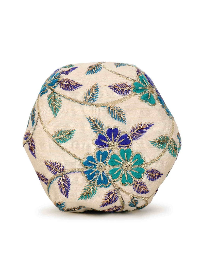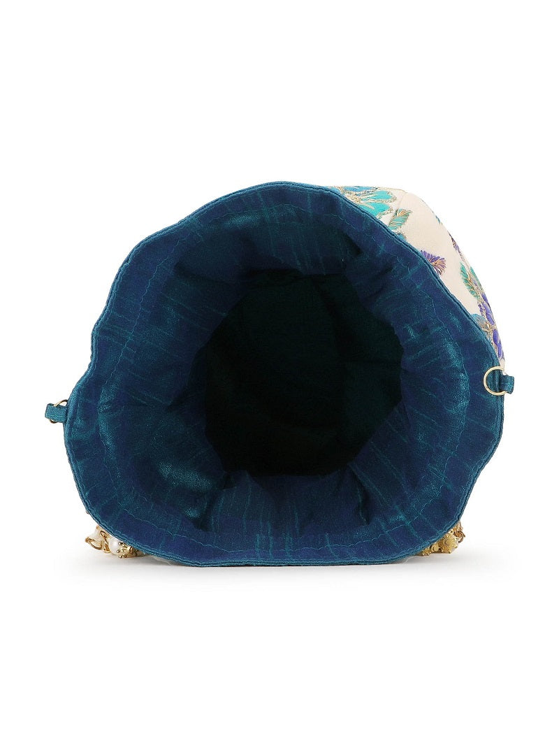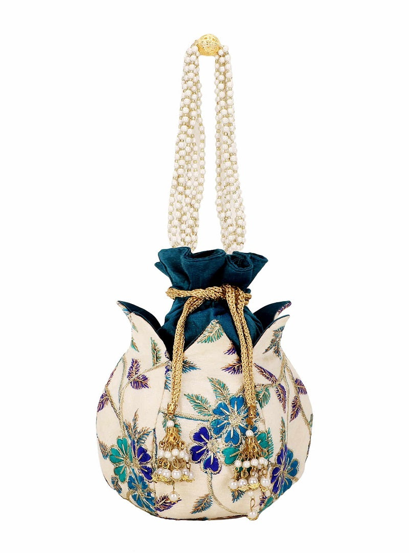 Lotus Cream and Turquoise Blue Floral Embroidered Faux Silk Potli