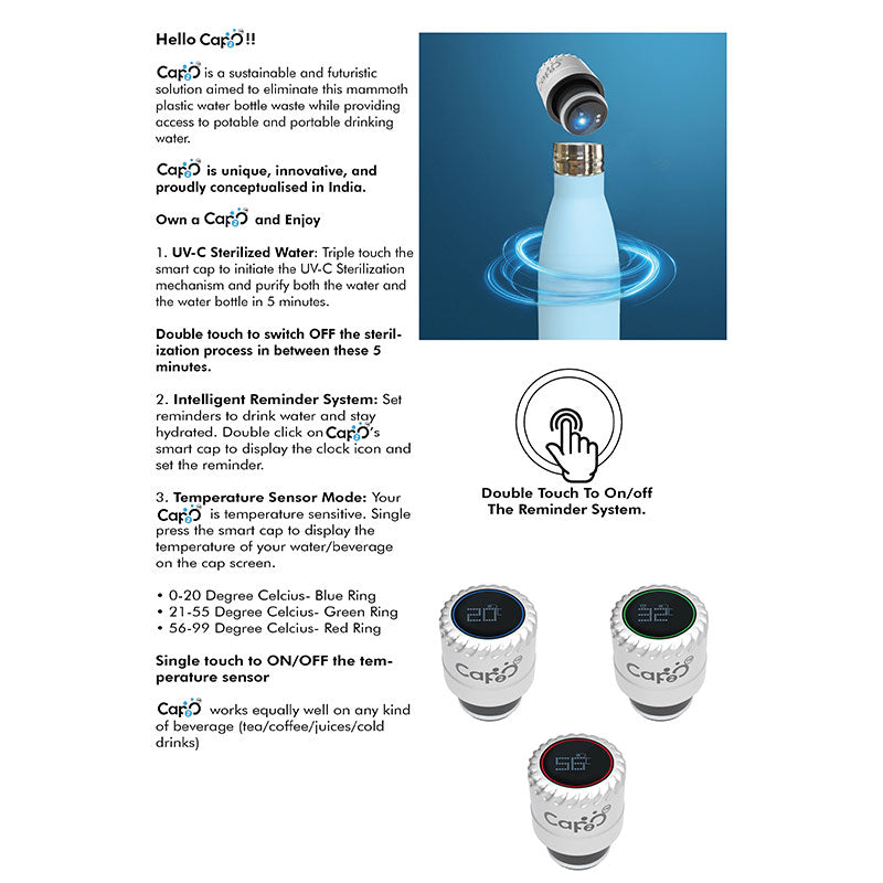 UV sterilization: Boasting a UV based purification system, this Cap2O Water Bottle kills up to 99.99% of Bacteria & Virus in Just 5 Minutes, UV disinfection breaksdown certain chemical bonds and scrambles the structure of DNA, RNA and proteins to effectively killall microorganisms.
