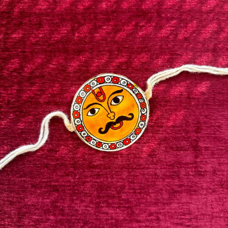 Today, this unique art form faces extinction as we see the monopolization of virtual forms of media and entertainment. This Rakhi is made by Sudhakar, a traditional Tholu artist who inherited this art from his ancestors. It contains animal motifs on a traditional leather base, painted with natural colours mixed with neem gum on treated leather.