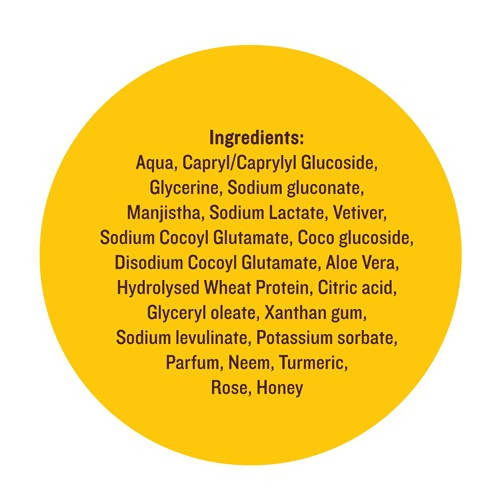 • Indian Rose Face Wash with Turmeric & Honey -Aqua, Manjistha extract, Sodium lactate, Vetiver (or Khus) extract, Sodium cocoyl glutamate, Disodium cocoyl glutamate, Hydrolysed wheat protein, Citric acid, Coco glucoside, Glyceryl oleate, Aloe Vera (or Gwarpatha) juice, Neem infusion, Xanthan gum, Sodium levulinate, Potassium sorbate, Parfum, Turmeric (Curcuma longa) extract, Rose infusion, Honey (Mel)
