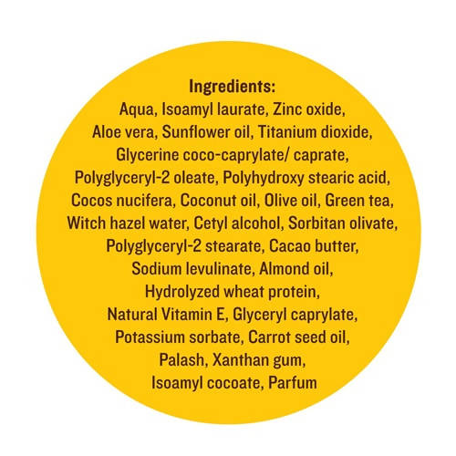 • Sun Protection with Aloe & Green Tea - SPF 30 - Aqua, Aloe Vera (or Gwarpatha) juice, Sunflower oil , Natural Vitamin E (Tocopherol), Coconut oil(Cocos nucifera), Olive oil (Olea europaea fruit), Green tea, Witch hazel water, Carrot seed oil , Titanium dioxide, Glycerine coco-caprylate/ caprate, Polyglyceryl-2 oleate, Polyhydroxy stearic acid, Cetyl alcohol, Sorbitan olivate, Polyglyceryl-2 stearate, Theobroma cacao butter, Sodium levulinate, Almond oil, Isoamyl laurate.