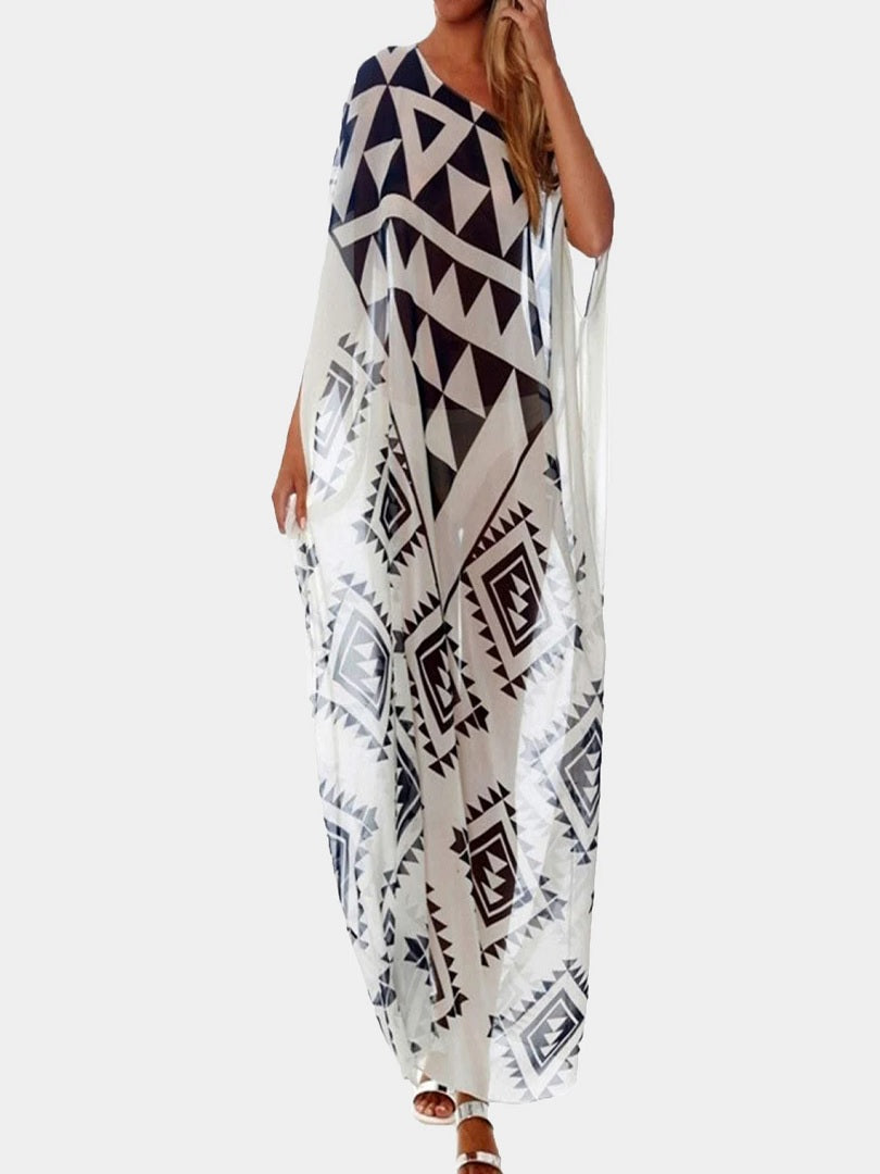 Women Georgette Geometric Print Off Shoulder Batwing Sleeve Beach Kaftan J5635