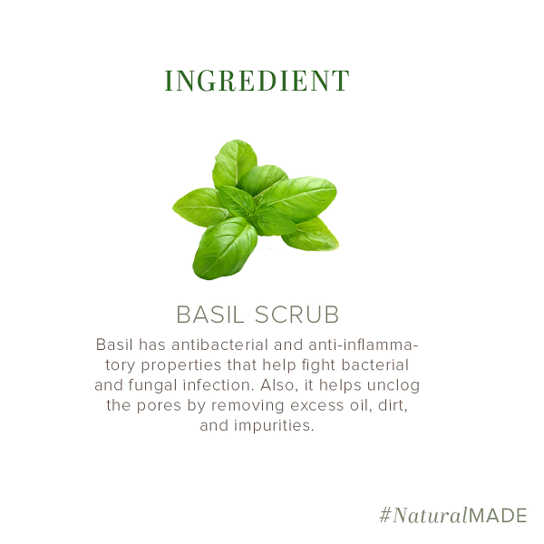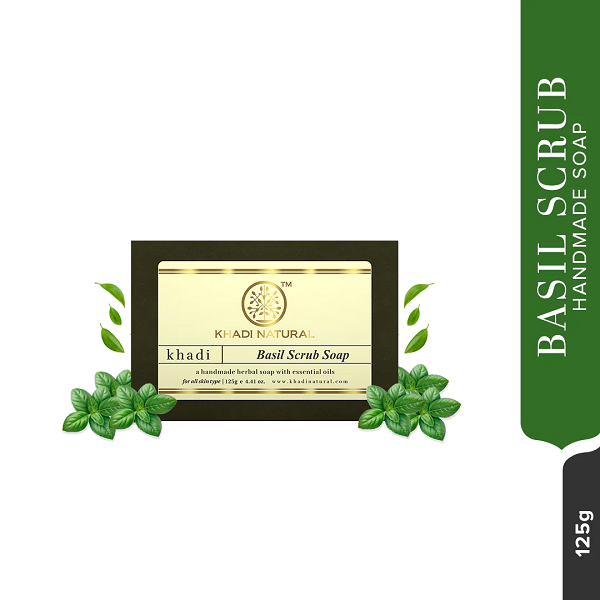 • Khadi Natural Basil Scrub Soap is a combination of carefully chosen mild soap base along with extracts of basil that provide gentle care to your skin. This soap is a boon for oily skin as it helps unclog clogged pores by removing dirt and impurities.