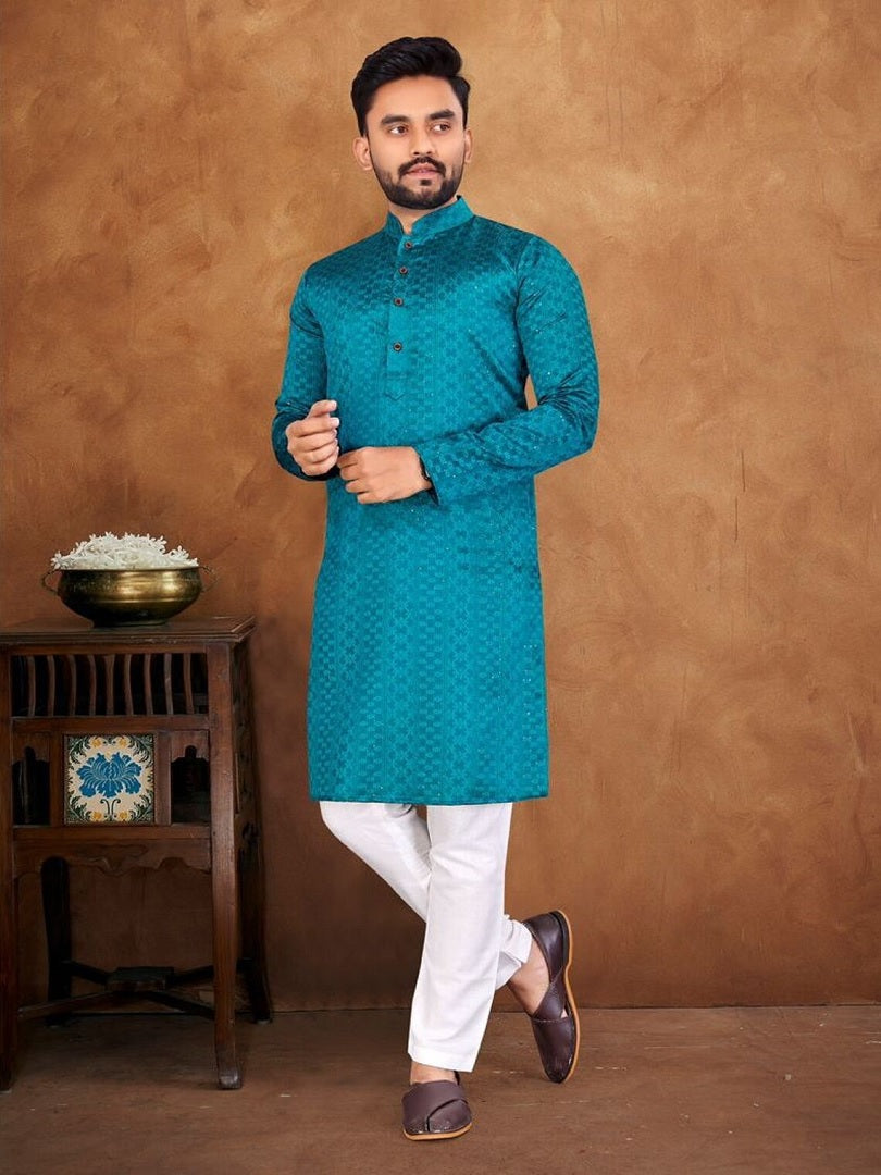 Men's Solid Straight Jacquard Silk Kurta Cotton Pyjama Set Kurta for Men