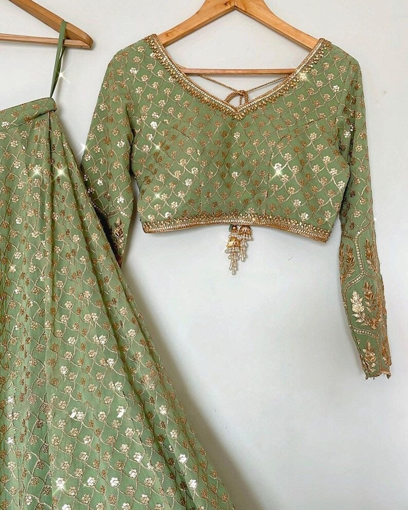 Elevate your wardrobe with the epitome of luxury and style. Embrace the enchantment of our Green Sequence Work Lehenga and make every moment unforgettable.