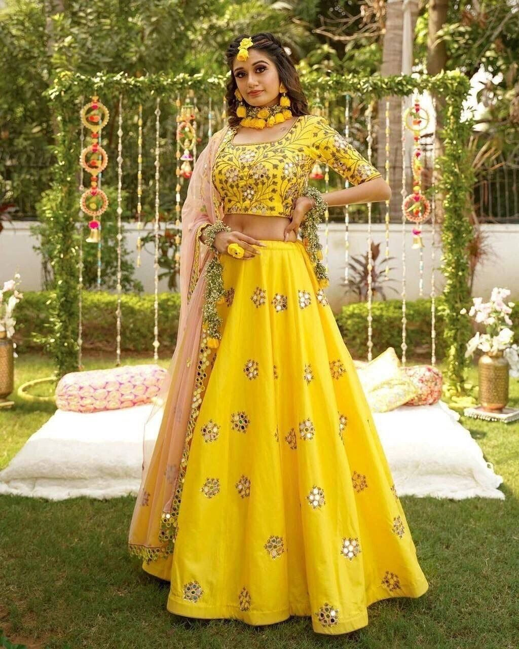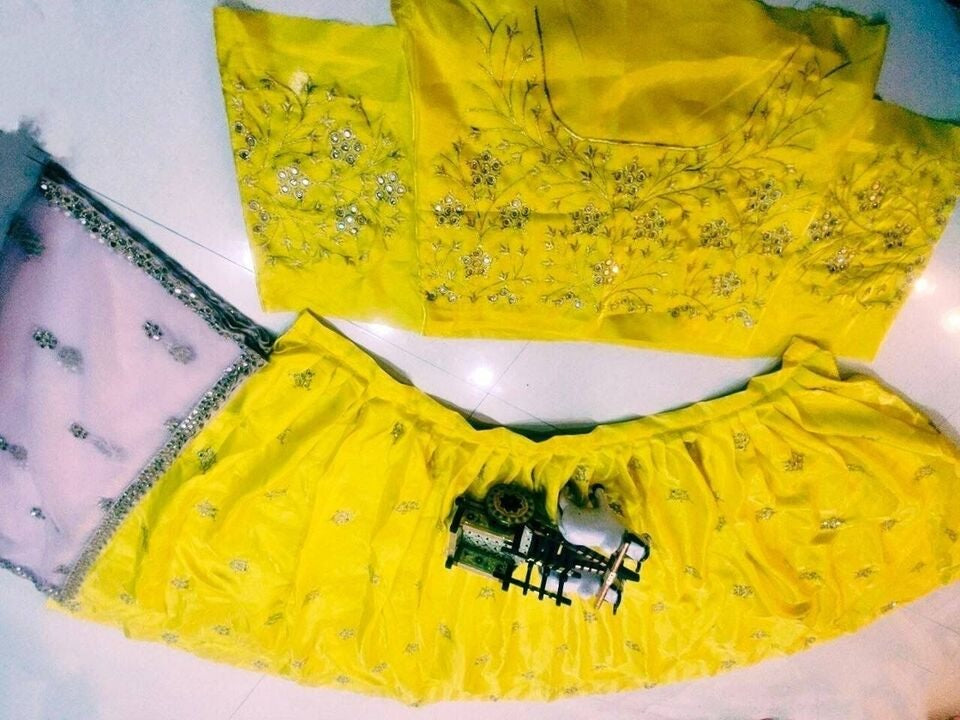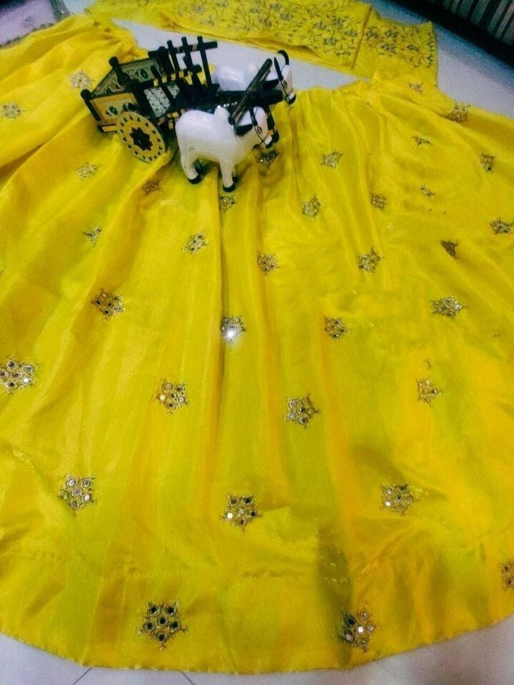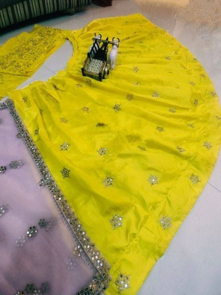 Yellow Satin Silk Embroidery Mirror Work Lehenga Blouse Dupatta
