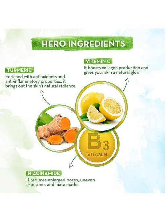 • Vitamin C, Turmeric, Niacinamide, Glycerin