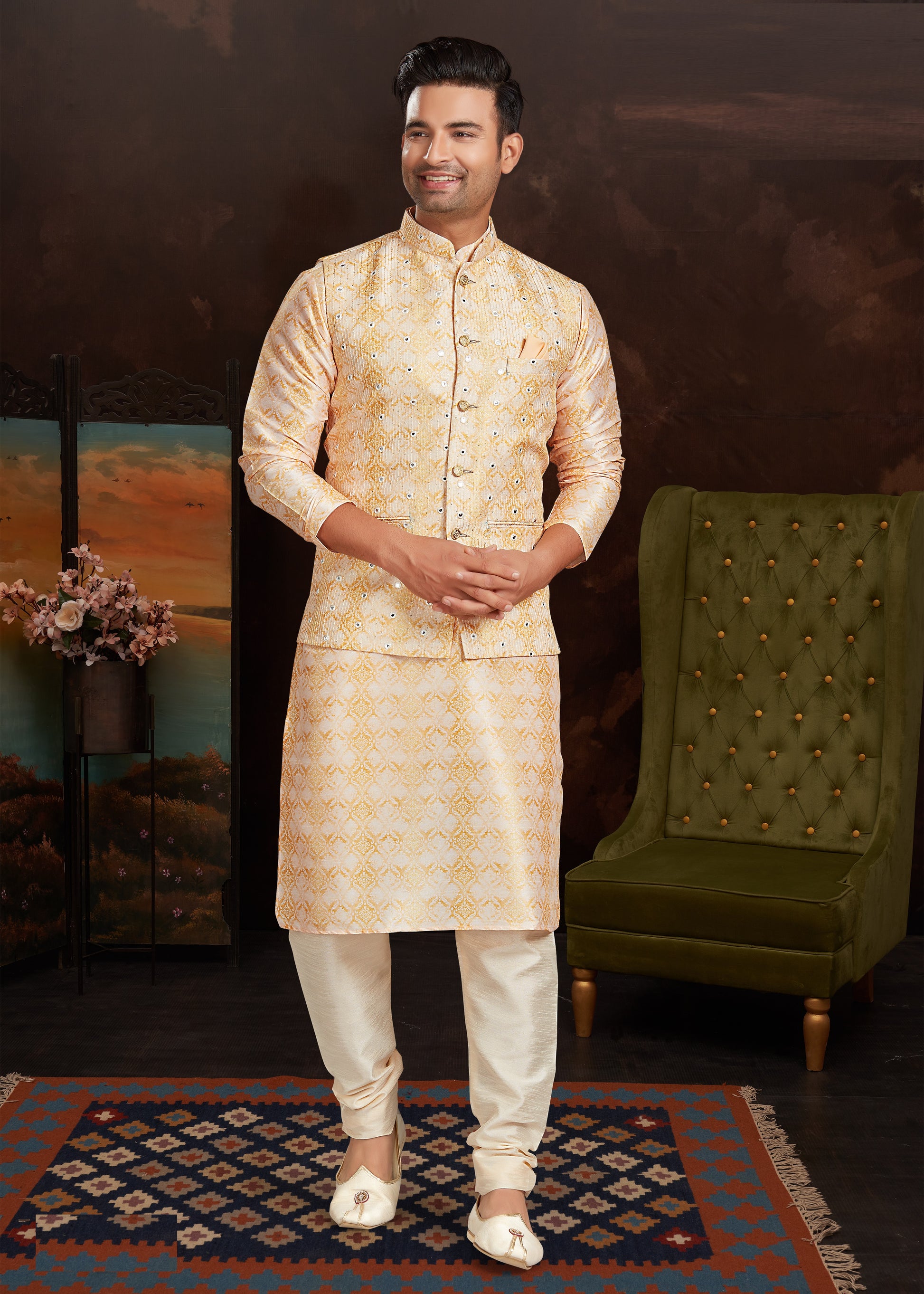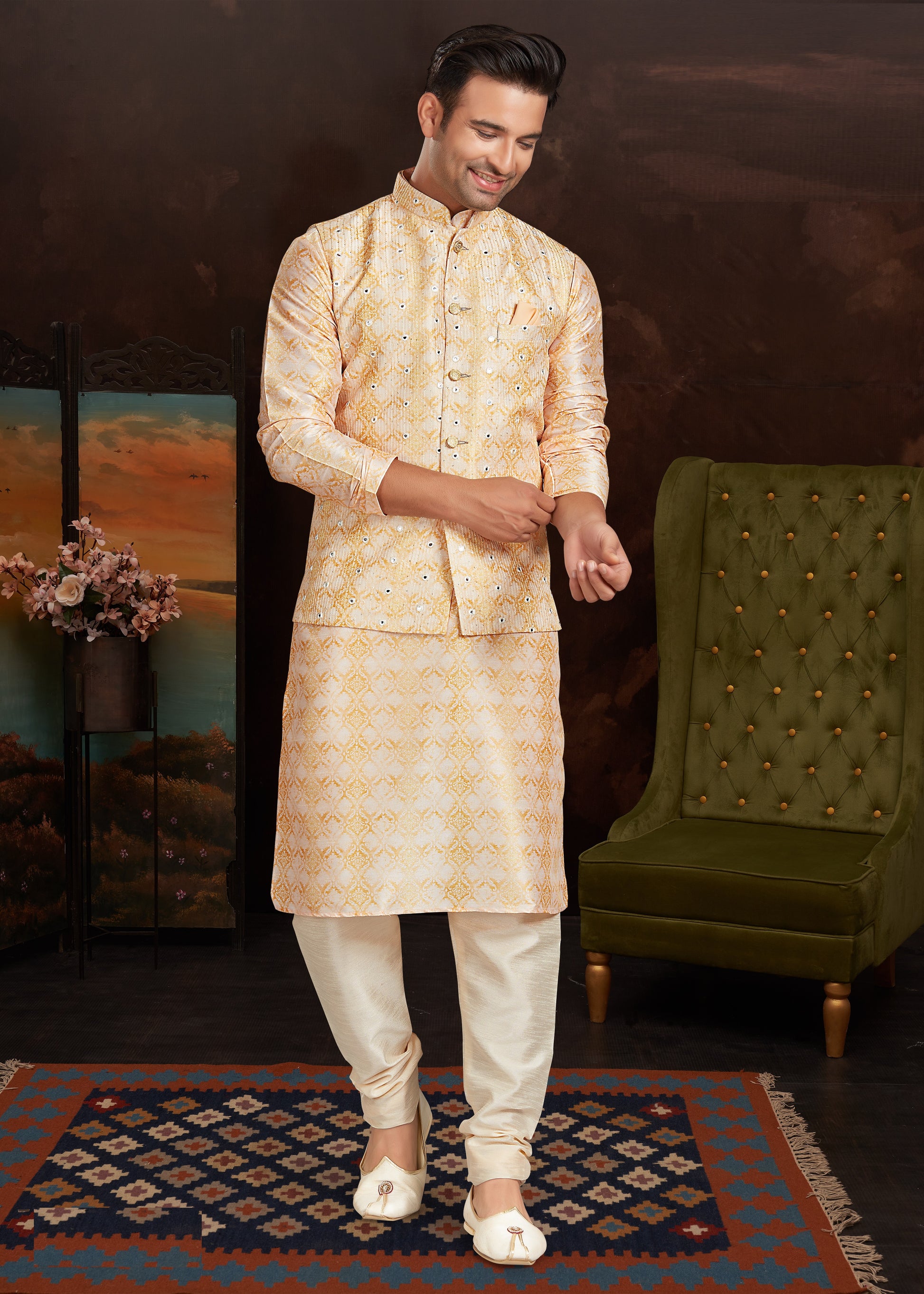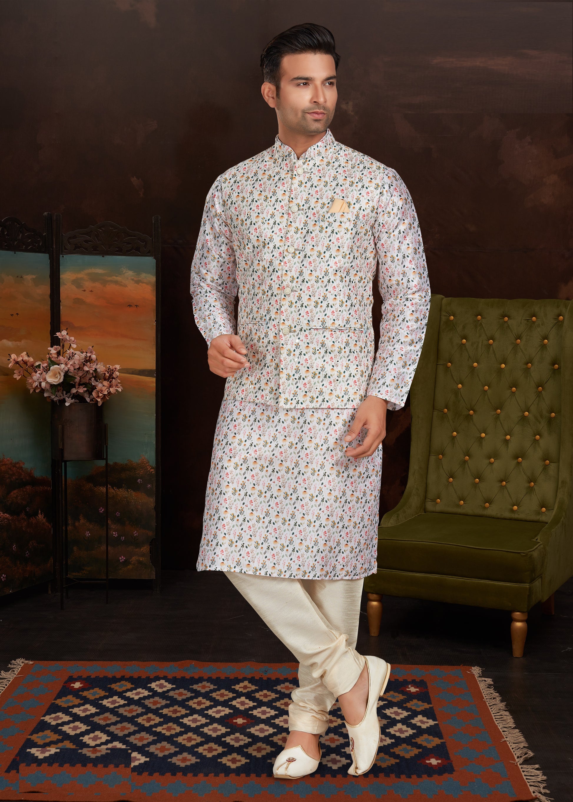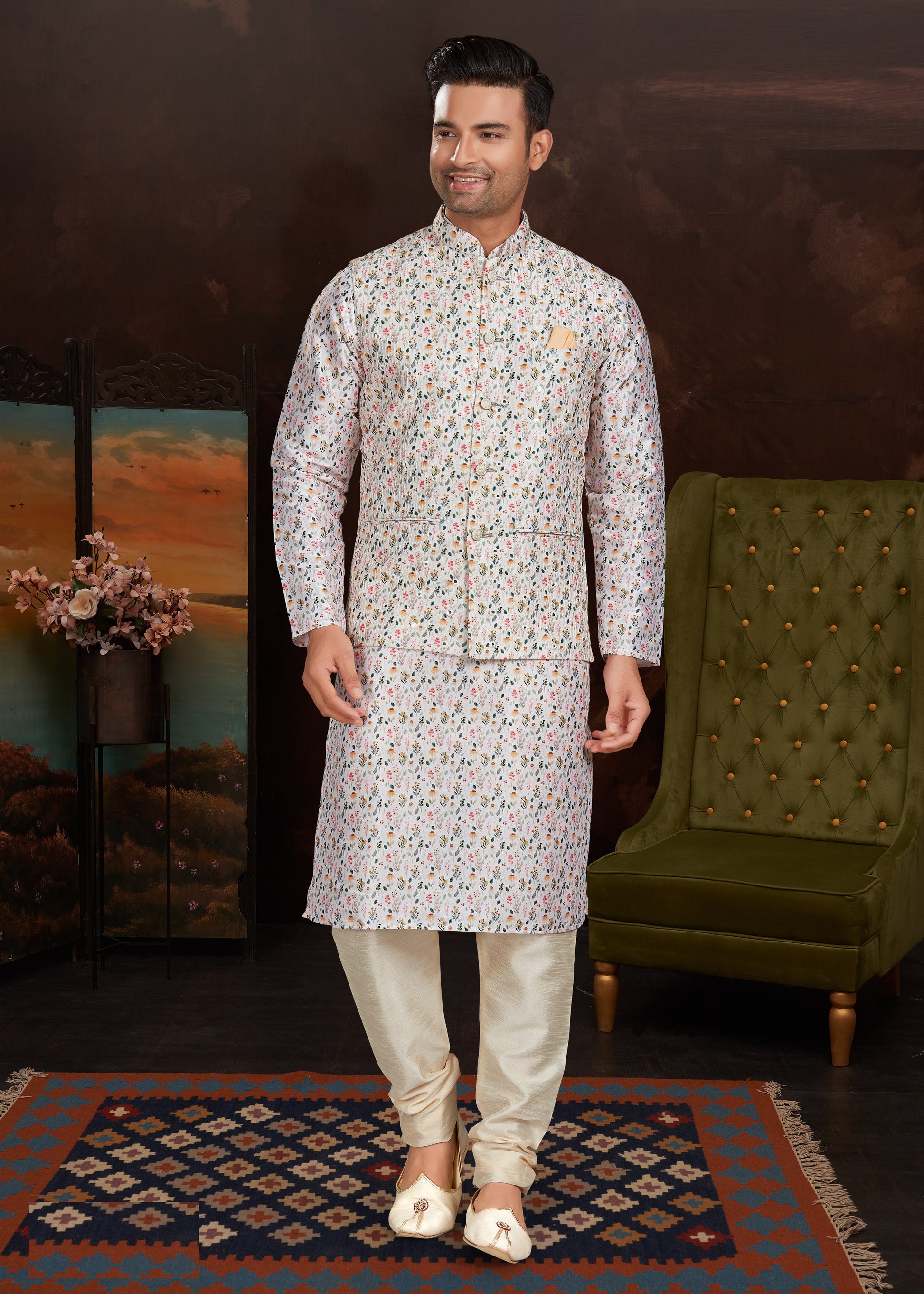 Malai Silk Kurta Pajama With Jacket Set For Men's