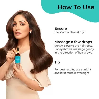 Apply a few drops or as needed, close to the hair roots on dry and clean scalp. Massage in gently with fingertips for enhanced absorption. For eyebrows, take a couple of drops on the palm and massage gently in the direction of hair growth.