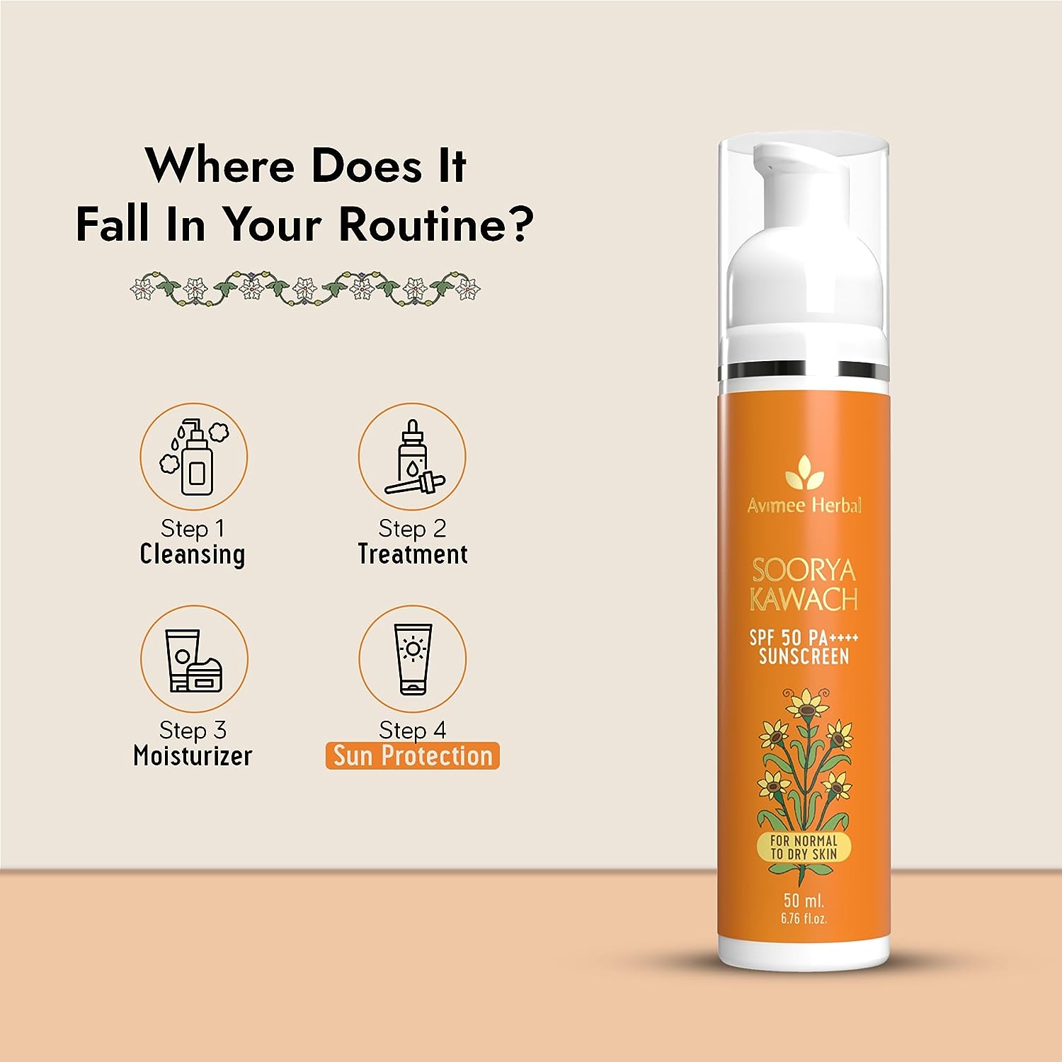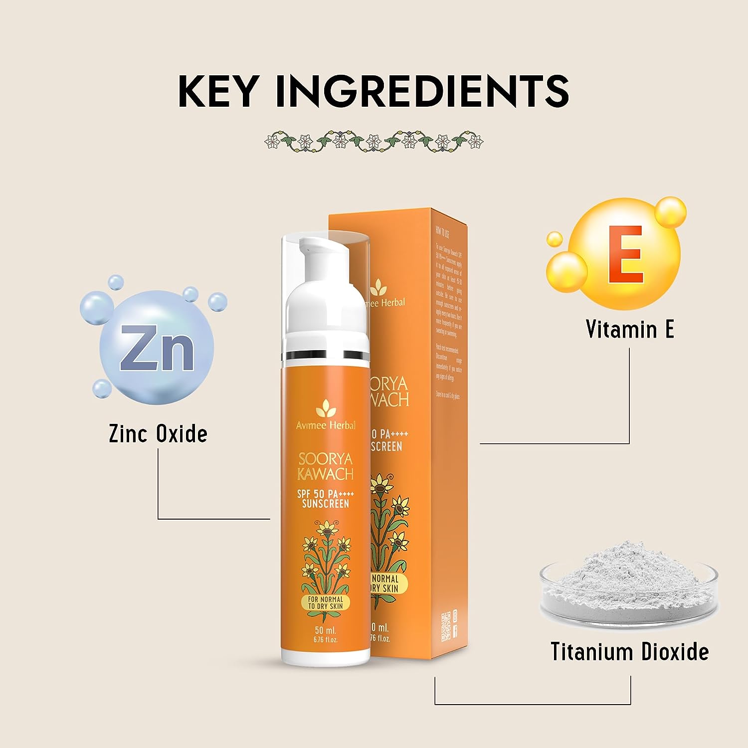 Avimee Herbal Soorya Kawach Sunscreen SPF 50 PA++++ No White Cast, Non Greasy, Light Weight 50 ML