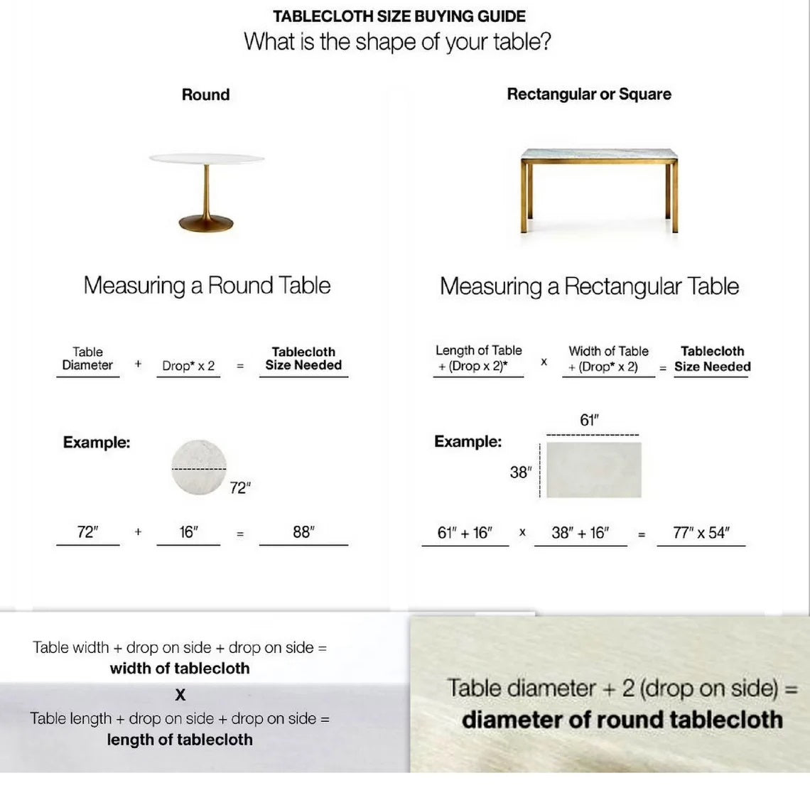 Rectangle 52" x 70", 52" x 90", 60" x 84", 70" x 90", 70" x 108", 70" x 144", 90" x 132"