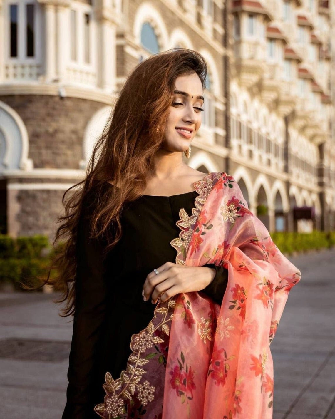 Black Faux Blooming Long Gown Dress With Dupatta