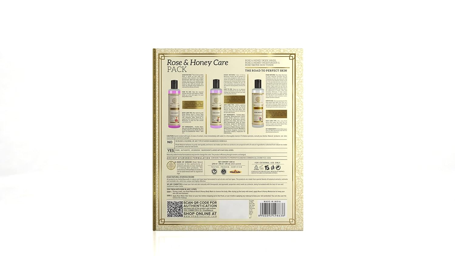 Rose & Honey Body Wash is gentle on your body and provides fresh moisture and healthy glowing skin. Wash your way to softer, cleaner skin with a rich, bubbly lather bursting with fragrance. Enriched with honey to give soft and smooth skin. Enjoy the beautiful floral fragrance of rose and the softness of honey. Khadi Natural Rose & Honey Moisturizer is suitable for all skin types. Keeps skin hydrated throughout the day by leaving a soft, comforting, and lingering fragrance. Rose Water Skin Toner has been specially formulated with the goodness of Rose and other certified components like, Aloe Vera extracts, etc. that are known to work absolute wonders for the skin. This rose water skin toner comes with a soothing effect and it helps heal stressed-out skin and any kind of other skin irritations or infections. Helps protect the skin from the day to day damage and comes with a host of skin-brightening benefits that help reduce the appearance of marks, spots and blemishes effectively. It helps remove blackheads and works as a great cleanser that helps get rid of accumulated dirt, dust, and impurities which prevents acne, pimples, and other breakouts