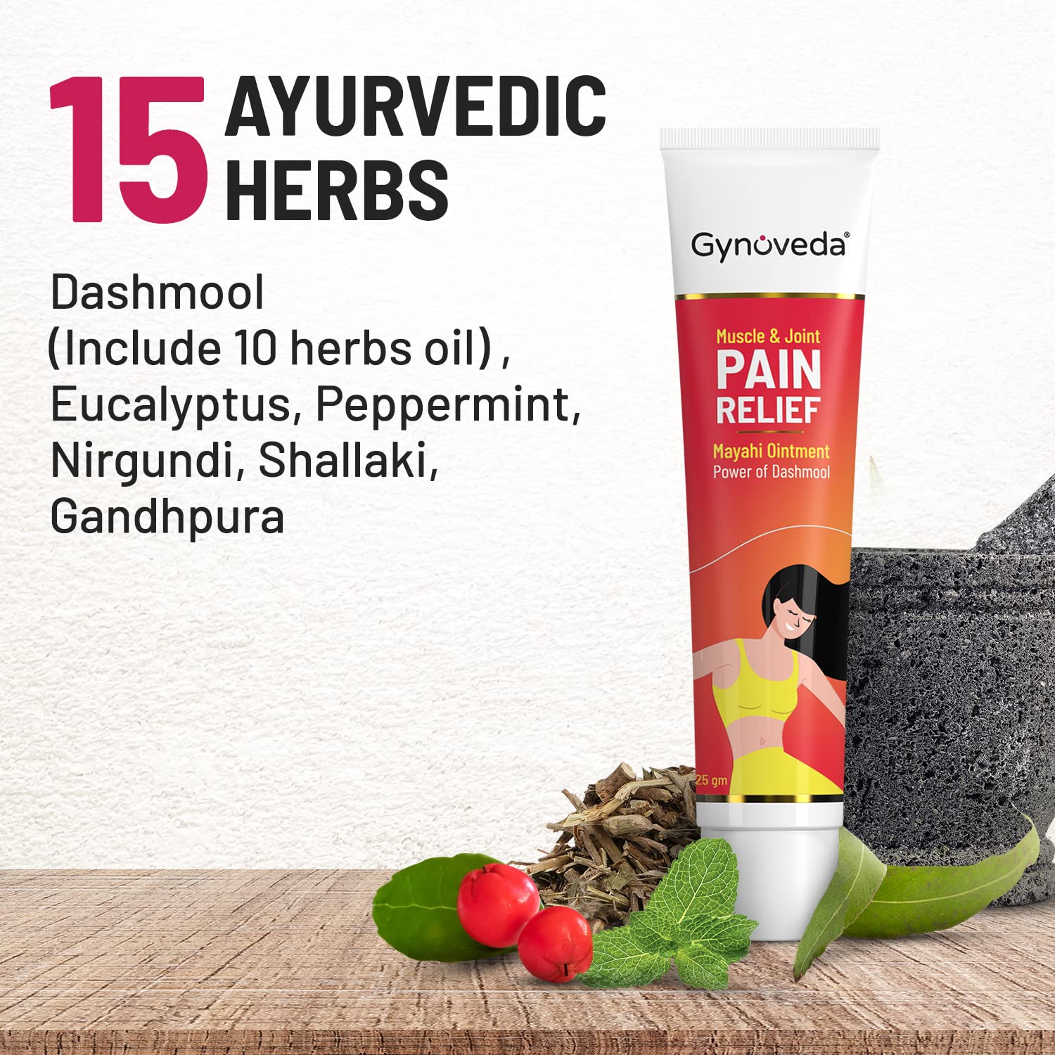 • Gynoveda Muscle & Joint Pain Relief Mayahi Ointement (25gm Each) is an Ayurvedic formula made with 15 clinically tested herbs.