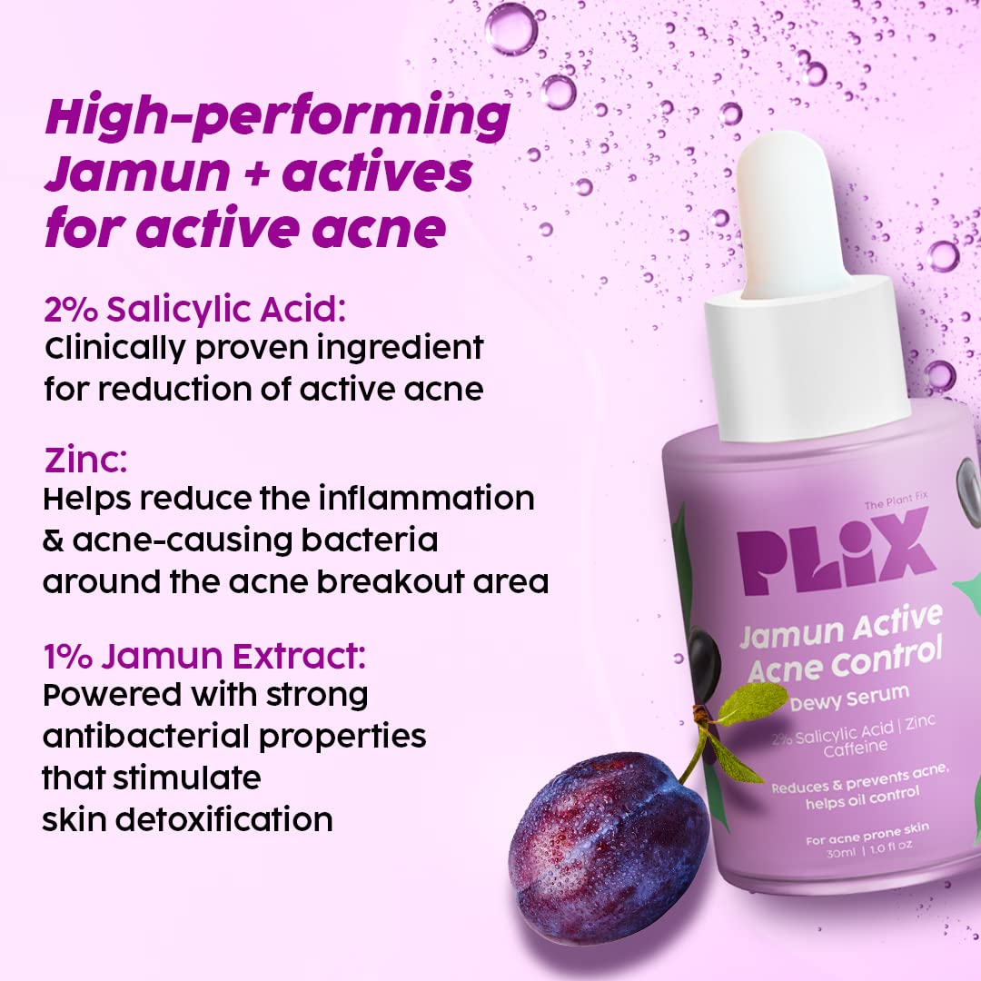 PLIX - THE PLANT FIX Jamun Active Acne Control Dewy Serum and Acne Fighter Combo for Active Acne & Dark Spot Reduction with 2% Salicylic Acid & Caffeine for Breakout Control