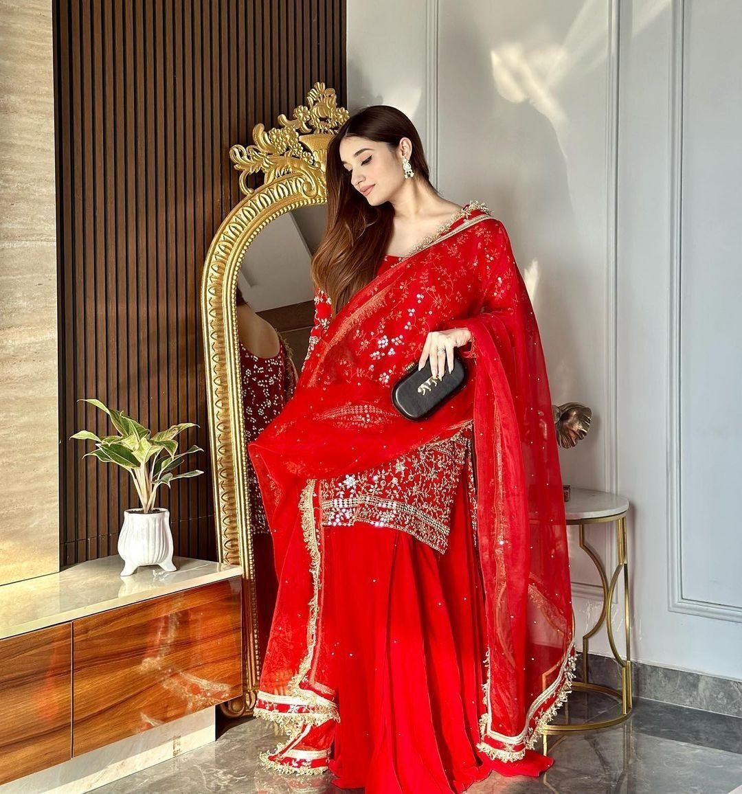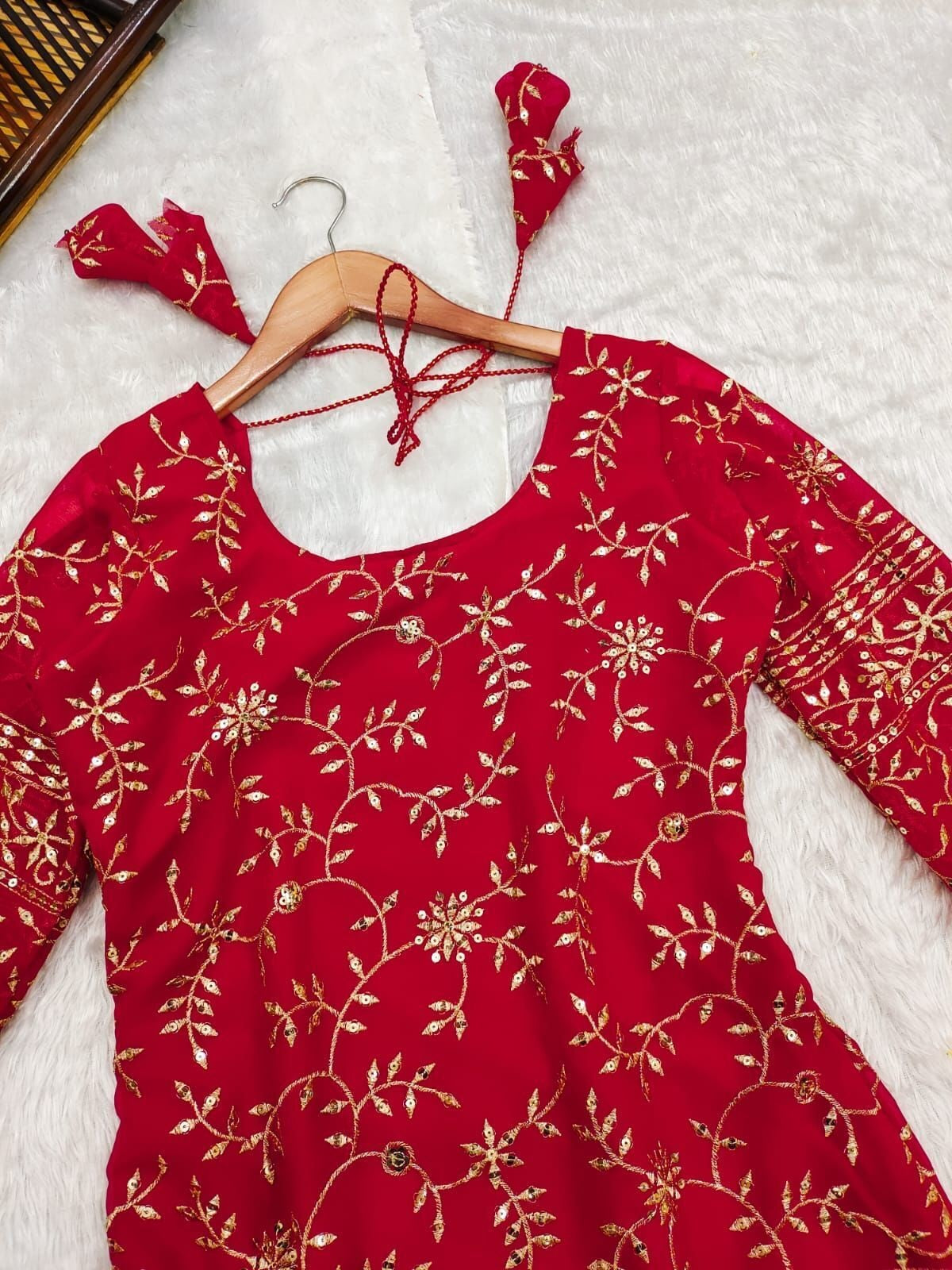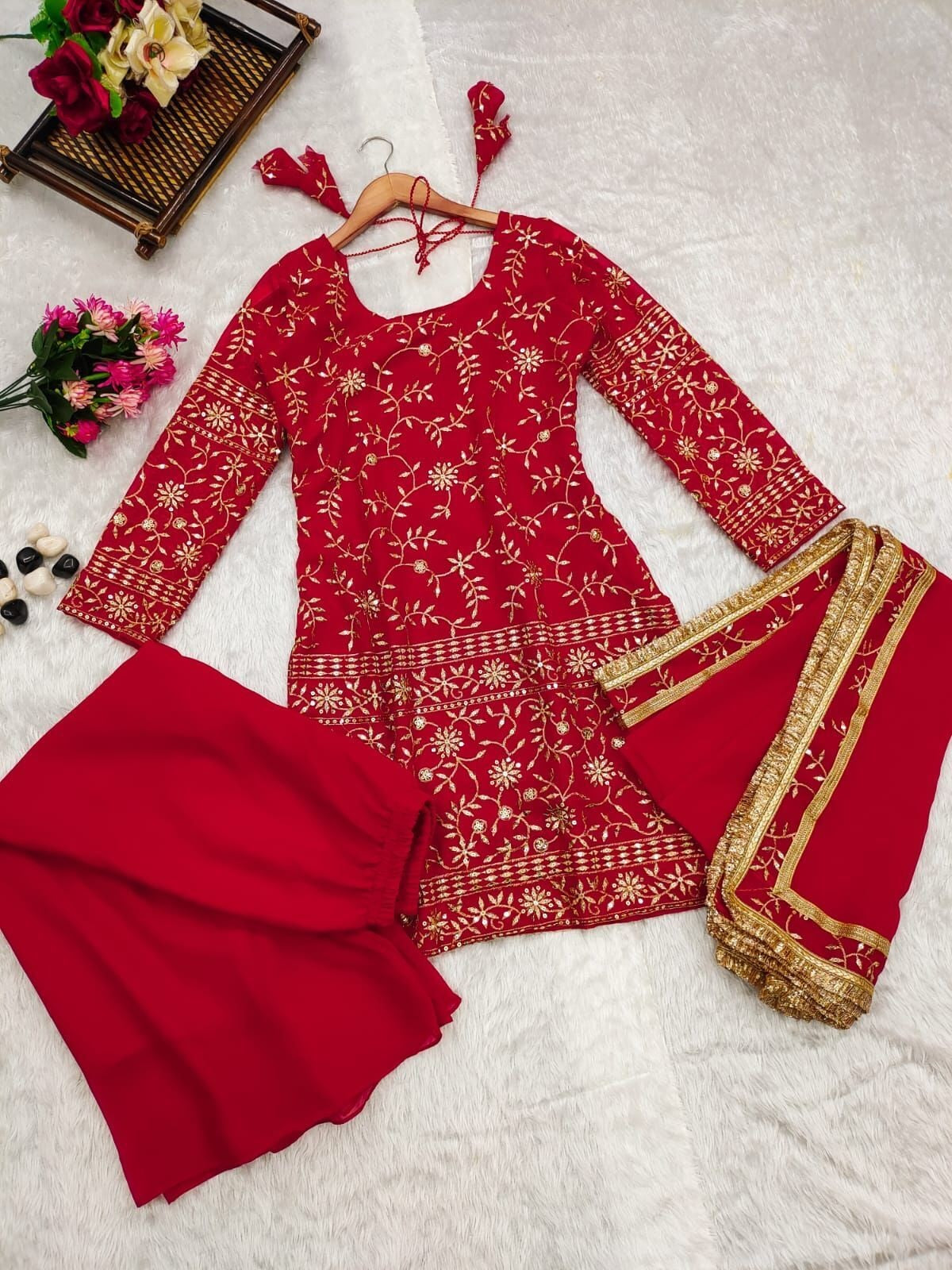 Red Blooming Georgette With Embroidery Work Top Bottom & Dupatta