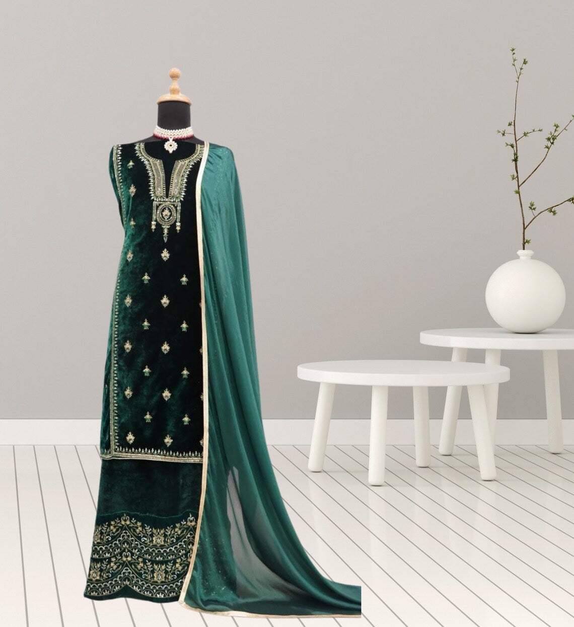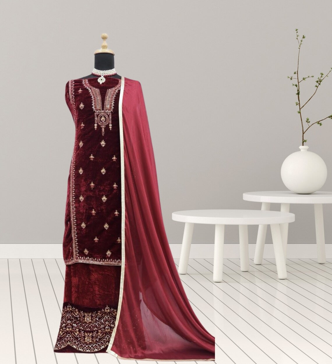 Pure Viscose Velvet Embroidery Sequence Work Top Bottom Dupatta
