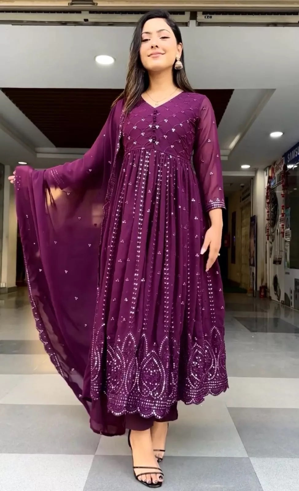 Faux Georgette Embroidery Sequence Work Salwar Kameez With Dupatta