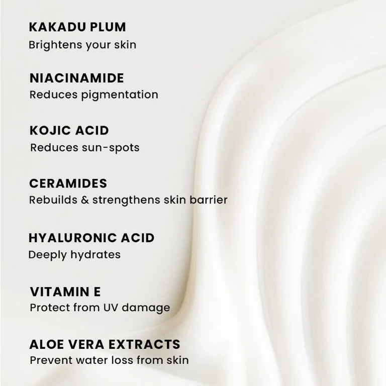 HOW IT DOES: All thanks to the 7 hyphened ingredients (most of which are antioxidant-rich) that are sourced from Nature & Science - Kakadu Plum Extract, Niacinamide, Kojic Acid, Ceramides, Hyaluronic Acid, Vitamin E and Aloe Vera Extract.
